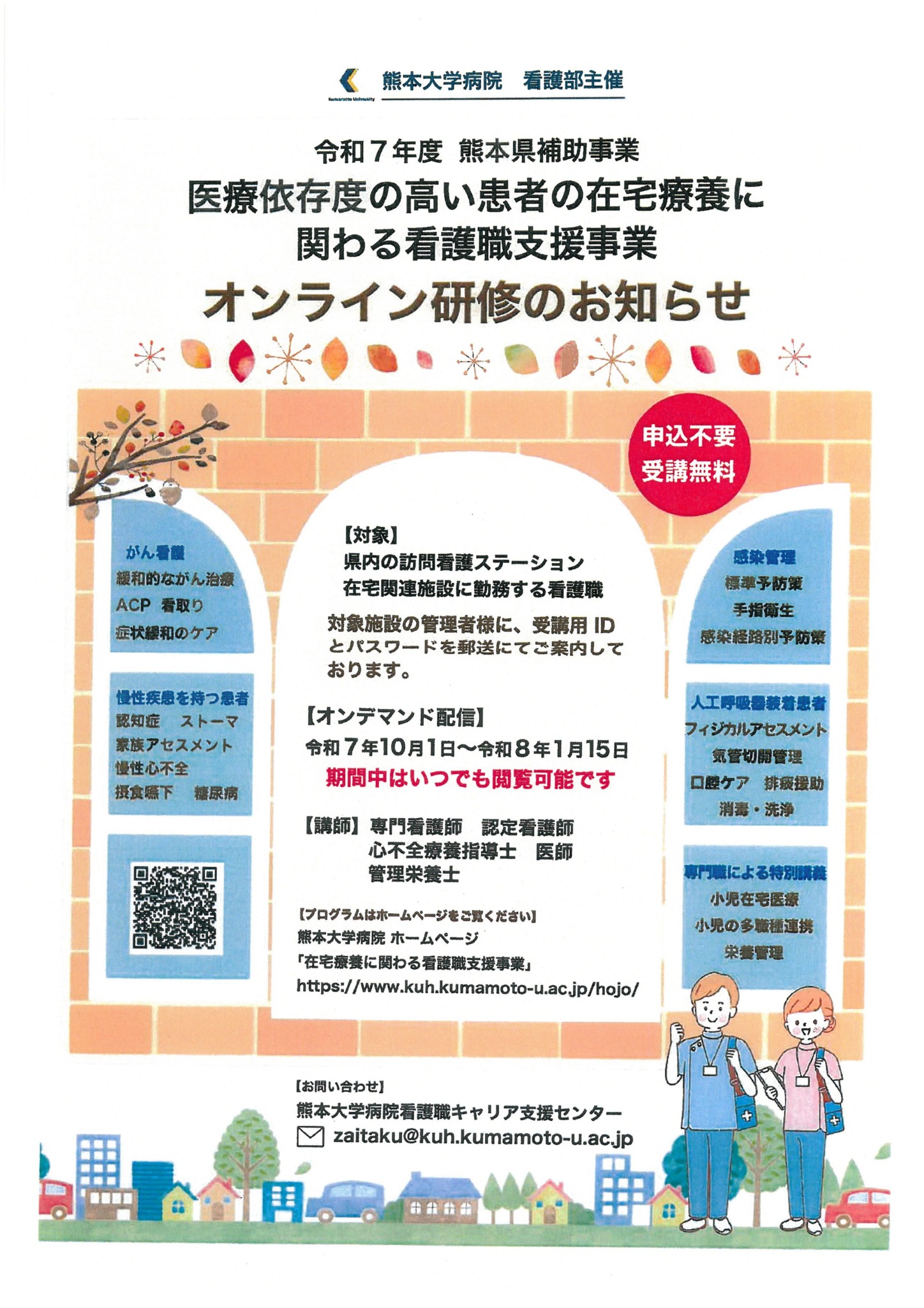 熊本大学病院看護職キャリア支援センターより、「医療依存度の高い患者の在宅療養に関わる看護職支援事業」オンライン研修開催のお知らせです。