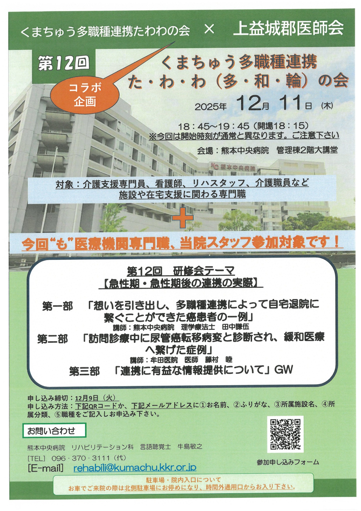 なお、今回は、くまちゅう多職種連携たわわの会と上益城郡医師会の共同企画となっております。